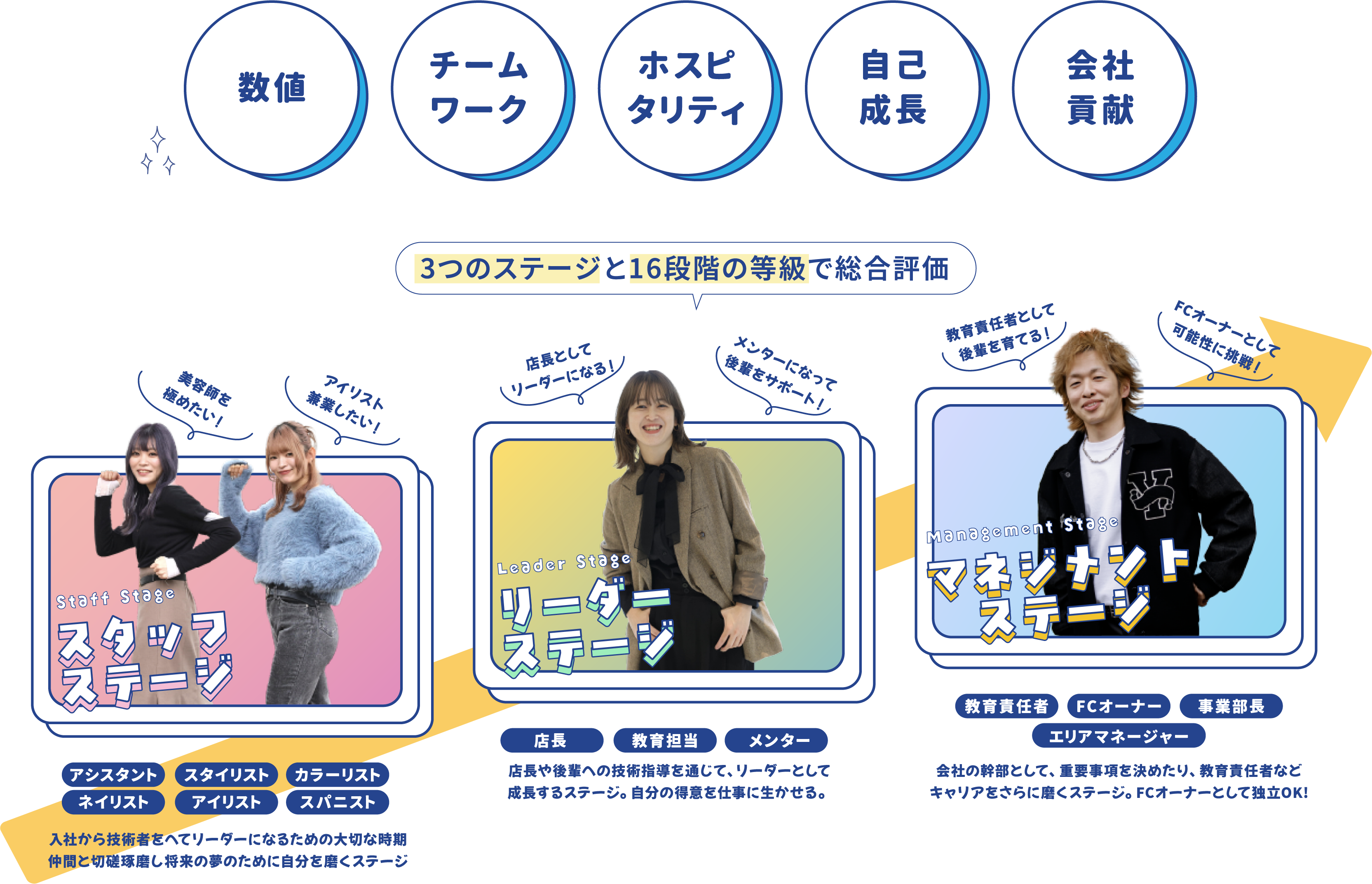 Du・Payグループでは、3つのステージと16段階の等級でスタッフの日頃のがんばりを総合評価。 誰もが将来に渡って安心して働くための評価制度を整えています。